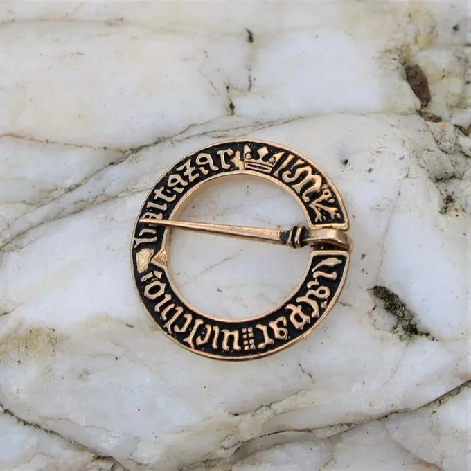 Cette broche anneau médiévale est une réplique d’un original fabriqué en France entre 1350 et 1450. La broche a été fouillée en Angleterre. La broche contient l’inscription « nazaren de ihesus [nous] iudeoru Rex [m] « (Jésus de Nazareth, roi des Juifs). Brooches comme celui-ci ont été portés dans une grande variété dans toute l’Europe médiévale.
