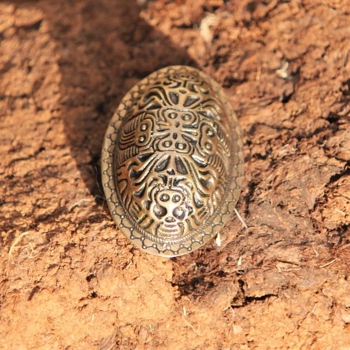 Cette broche est faite à la main en bronze et mesure 6 x 3,8 x 1,8 cm.