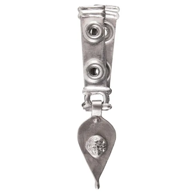 Cette extrémité de la ceinture joliment décorée est parfait si vous voulez faire vos propres ceintures romaines ou comme pièce de rechange. Ce raccord de ceinture est basé sur un original de la 2ème moitié du 1er siècle après JC. et a été trouvé en Serbie, près Tekija qui faisait partie de la province romaine de Pannonie. A l’origine, il a été monté à l’extrémité de 1 des sangles de ceinture en cuir suspendus verticalement sur le cingulaire d’un légionnaire romain. La mise en place de la ceinture est en laiton avec une couche d’étain, de sorte qu’il ressemble à elle est faite d’argent. Il a des trous pré-percés pour la fixation d’une sangle de ceinture.