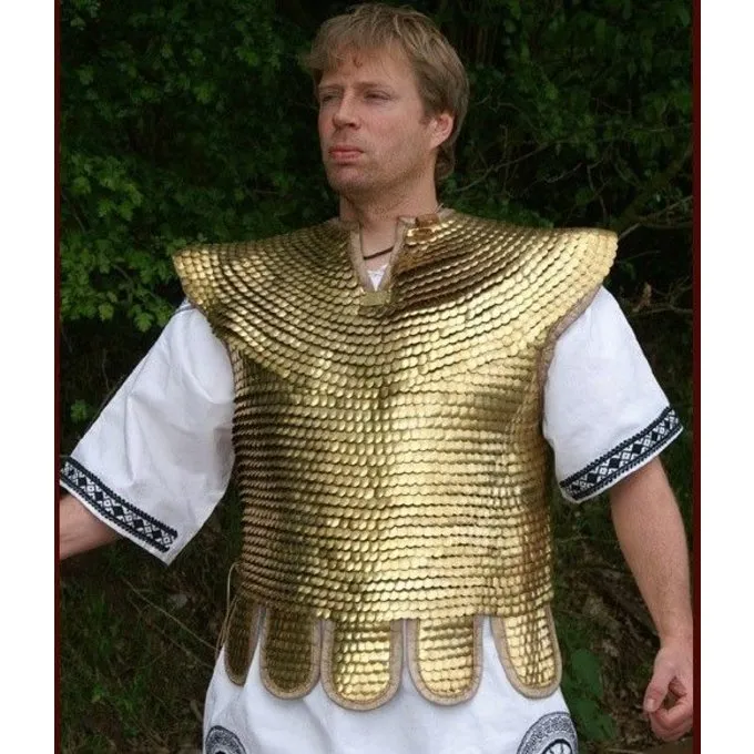 Une armure d’échelle comme celle-ci était portée par Roman Auxiliae pendant l’Antiquité. Il était principalement porté par les auxiliaires avec un patrimoine perse. En Perse, la tradition de porter une armure d’échelle comme celle-ci est encore plus ancienne et elle a même été portée avant les campagnes d’Alexandre le Grand. Dans Carnuntum, la capitale de la province romaine de Pannonie, plus de 30 variantes différentes de cette armure d’échelle ont été creusées. Cette armure d’échelle est en laiton, elle est basée sur des originaux portés autour de 100-250 après JC. Les écailles sont attachées à une couche de cuir.