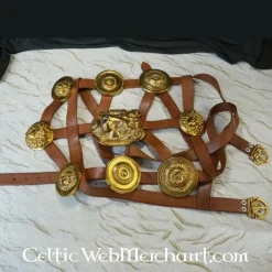 Cet ensemble complet de phallerae est basé sur plusieurs originaux. Phallerae étaient «médailles» gagné par le centurio pour des réalisations exceptionnelles. Le centurion portait ces phallerae autour du corps. A l’origine de ces trophées, qui contiennent souvent une représentation d’un visage, de la tradition celtique. guerriers celtes décapités leurs ennemis et ont pris la tête comme des trophées.