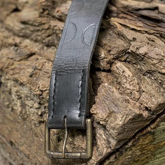 La ceinture est joliment décorée d’un motif imprimé profondément dans le cuir. La ceinture a un aspect intéressant, elle est composée de différentes pièces de cuir reliées entre elles par de petites pièces carrées.