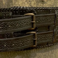 Cette extrémité de la ceinture est une réplique d’un original 14ème siècle fouillée à Londres. L’original est aujourd’hui partie de la collection du Musée de Londres. Cette extrémité de la ceinture est faite dans le style gothique et originaux similaires ont été portés toute l’Europe.