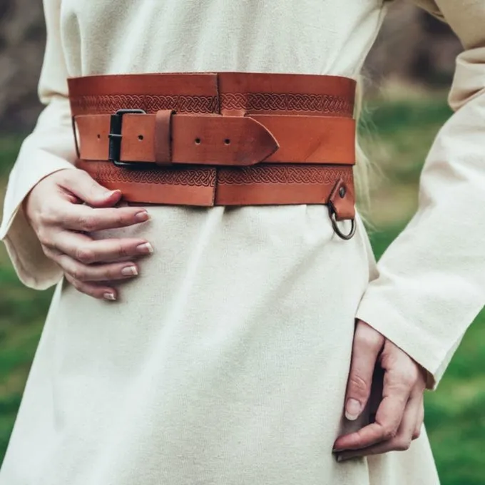 Cette ceinture de taille large est décorée d’un magnifique motif de nœud païen et d’une tailles différentes. Il convient à la fois pour les tuniques et les robes. Un bon accessoire pour votre tenue Viking, Valkyre Costume, Personnages de Larp et Photos Insta. Parce que vous pouvez régler cette ceinture à la taille, cela donne immédiatement à votre costume un ajustement élégant. La ceinture a 3 anneaux sur lesquels vous pouvez accrocher des accessoires tels qu’un porte-arme ou un sac. Vous pouvez porter la ceinture 15 cm plus serrée que la taille choisie. Par exemple, la taille 100 cm est réglable jusqu’à 85 cm.