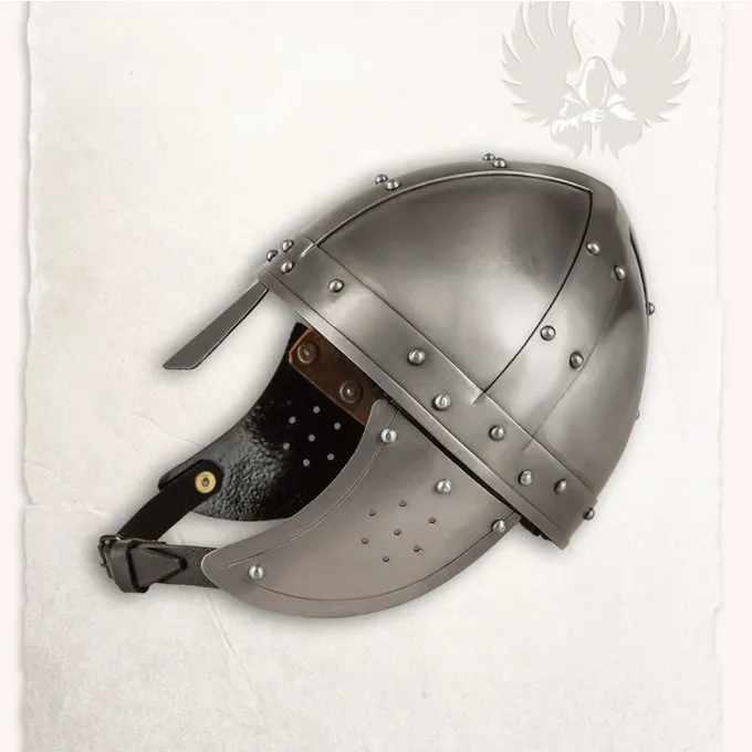 Ce casque est fait après les originaux germaniques qui ont été portés toute l’Europe à l’époque des grandes migrations. tribus germaniques comme les Goths, les Francs, Alamans et Frisons portaient des casques comme celui-ci. Les volets de la joue étaient un héritage des casques romains Galea et casques de cavalerie plus tôt que le Auxiliae germanique portait en service romain.