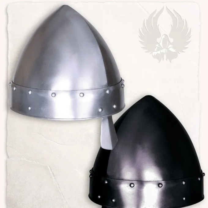 Casques comme celui-ci ont été portés par les chevaliers et l’infanterie au Moyen Age. Ils ont été portés pendant des siècles dans la plupart des régions de Europw. Les Vikings fin, les Normands, les Croisés et des Templiers utilisaient ces casques. La pièce nasale protège toute la vue, mais donne encore un champ de vision optimal.