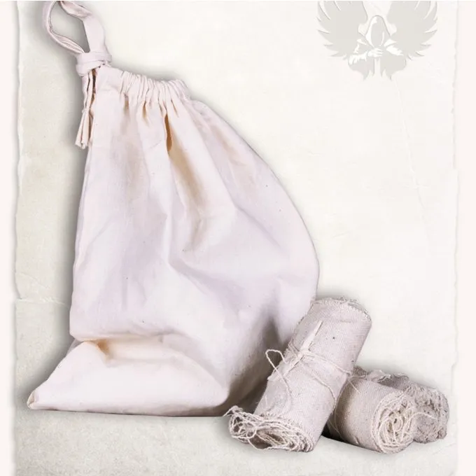 Ce sac en coton contient 10 rouleaux de bandages pour le théâtre, le film, la reconstitution et GN. Un accessoire pour votre personnage. Pendant les batailles de reconstitution et LARP vous pouvez traiter les combattants tombés avec ce sac de bandage. Le sac a une boucle de sorte que vous pouvez l’accrocher à votre ceinture. Vous pouvez simplement rouler le bandage après l’utilisation et de l’utiliser à nouveau. Vous pouvez également remplir le sac avec des bandages en auto-de vieux vêtements.