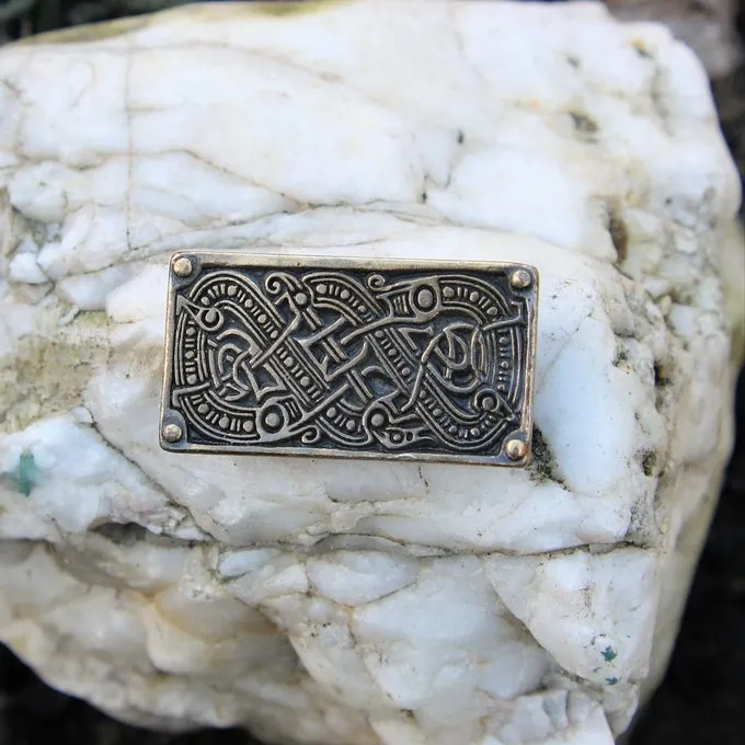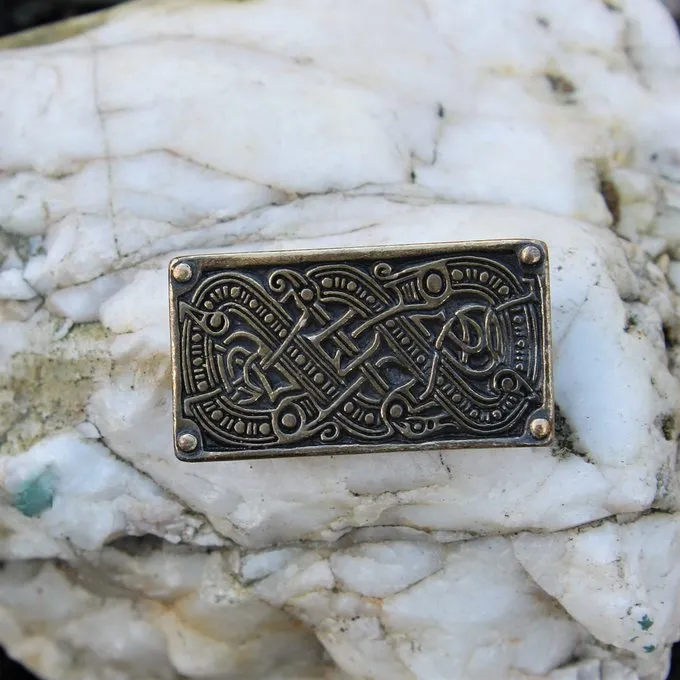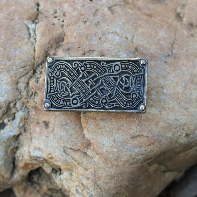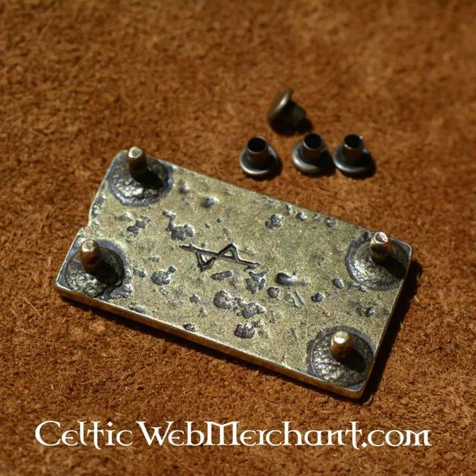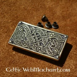 Ce raccord à la ceinture est basé sur un original germanique du 6ème siècle, trouvé à Valsgärde, en Suède. La période de Valsgärde peut être considérée comme le prédécesseur de l’âge viking. Le raccord de la ceinture est constitué de divers motifs de nœuds qui se terminent par des têtes de dragon.